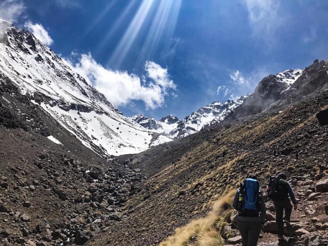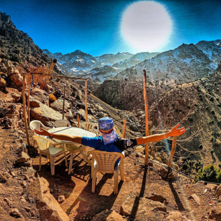 After an early breakfast at the hotel in Marrakech, at 9AM our driver will pick you up and take you to the heart of Morocco’s High Atlas mountains, the trek starts from Imlil (1740m), a small Berber village located at 1740m above the sea level, at 67km on the south west of Marrakech, here you will meet the team who will accompany you during this amazing adventure, the driver will drop you off in the village, the muleteers will deal with your luggage, food & all other equipments that we usually provide for our clients, within half an hour you start the walk with an experienced mountain guide through the Berber villages following a mule track which will take you to the mountain hut via the shrine Sidi Chamhrouch (2500m) where you will have your picnic lunch prepared in advance by our cook, after lunch & a short break, continue towards the refuge (3200m), as the mules walks faster, the muleteers & cook, will pass over & will be waiting for you at the hut or camp, get a tasty mint tea upon arrival while you will enjoying the scenic Mountain surrounded the based camp. The hot shower is available to clean your body and be ready for the next day.Option: the night could be spent on the tent but in summer time