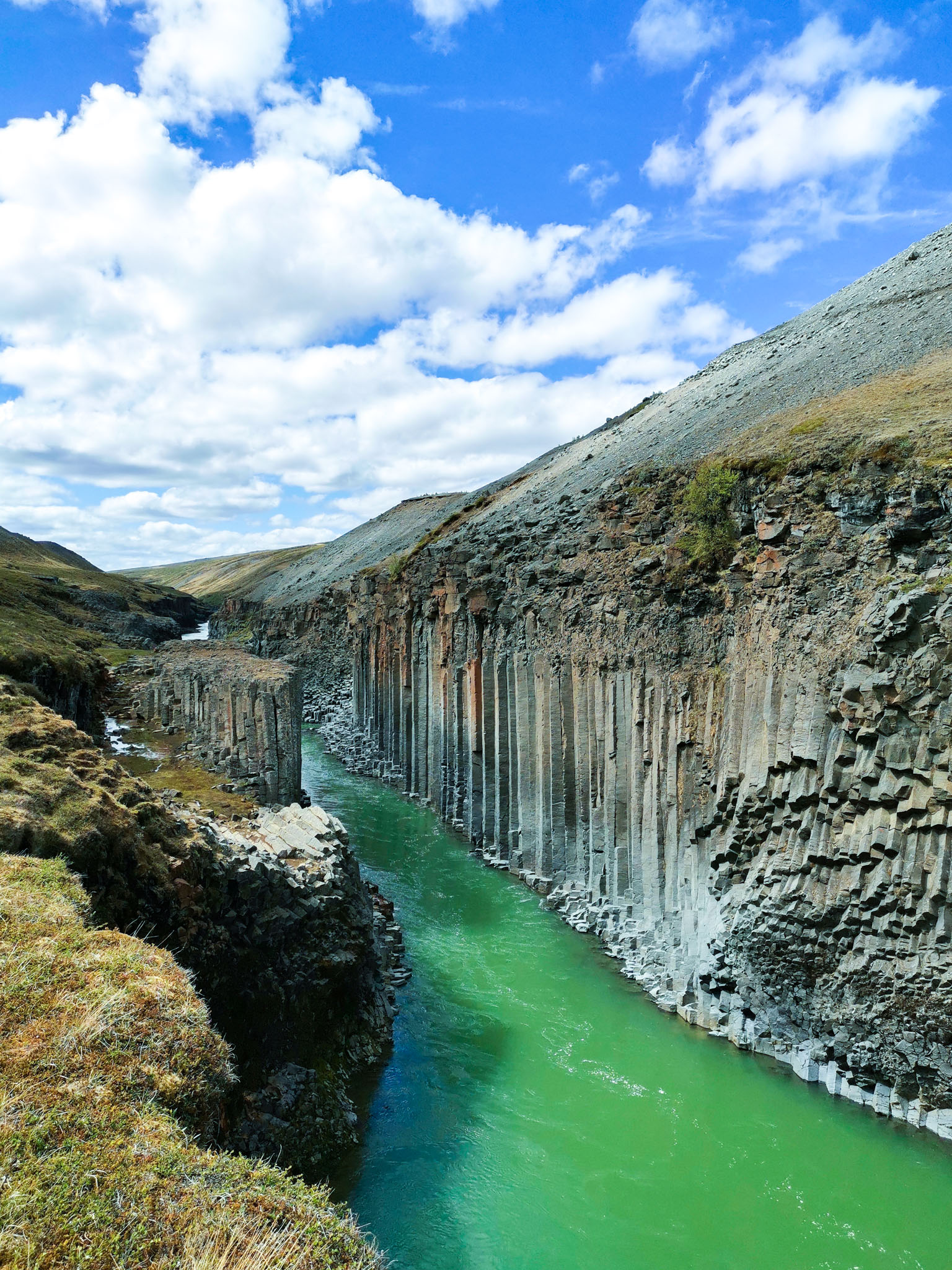 Stuðlagil Canyon is located in eastern Iceland in Glacier Valley. It´s recognizeable because of beautifull green/blue colour of the river and basalt rock formations.