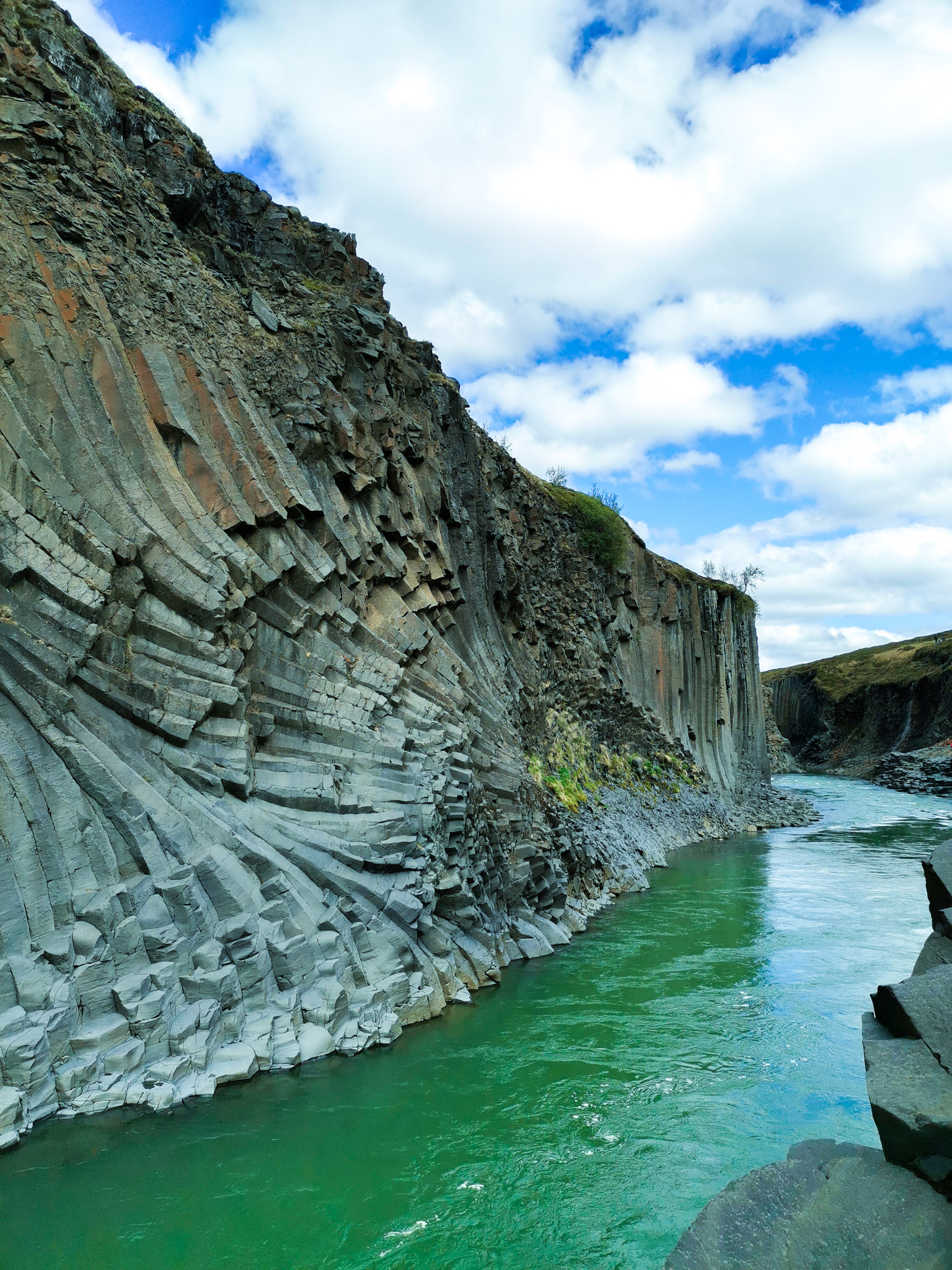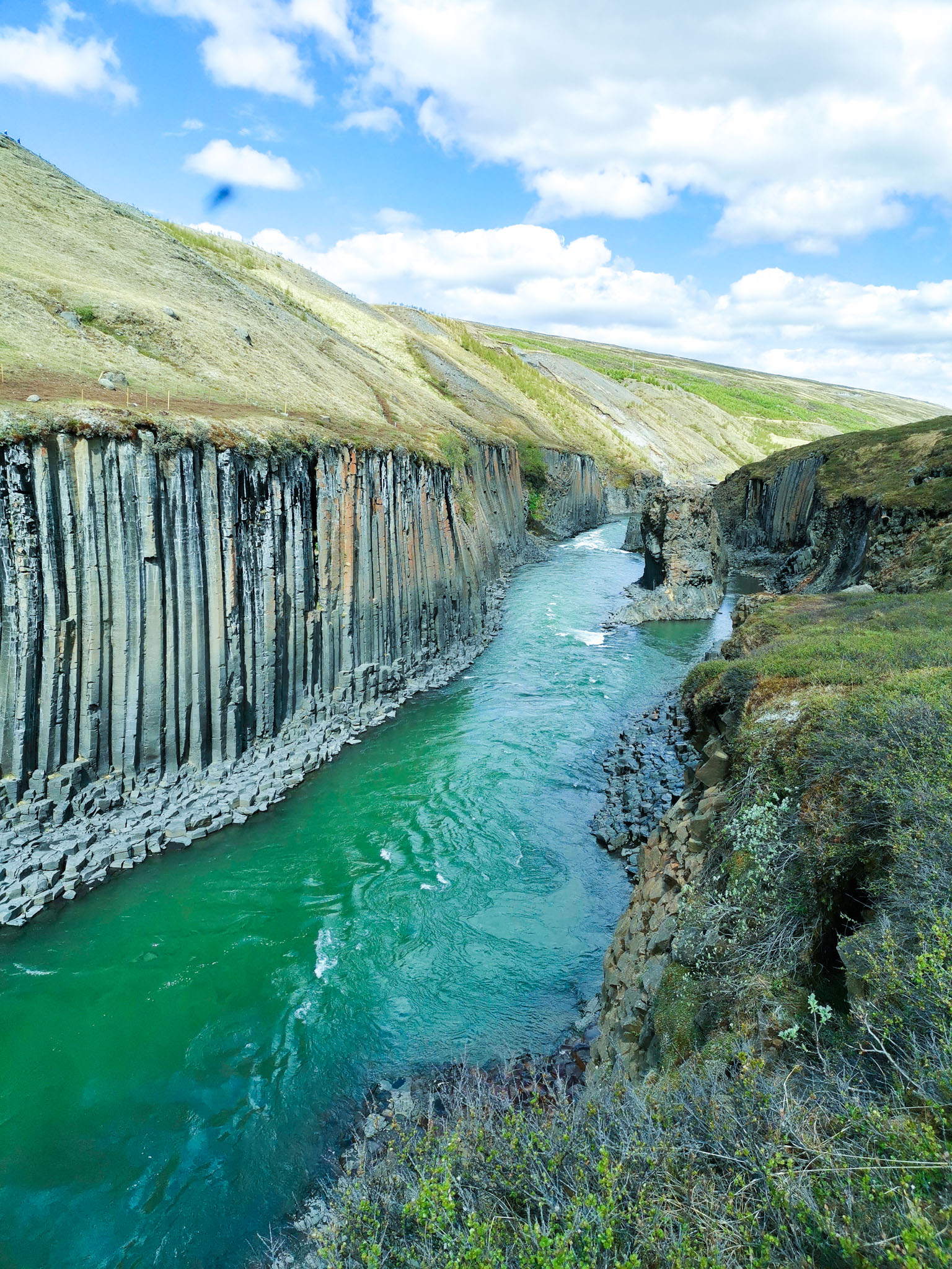 For long time this canyon wasn´t popular place to visit beacuse of really strong river current Jökulsá á Dal. The situation has changed when the hydroelectric plant was built on that river. The water level has changed, the power of the river decreased, not carrying anymore mud and sand. The river became clear and green coloured.