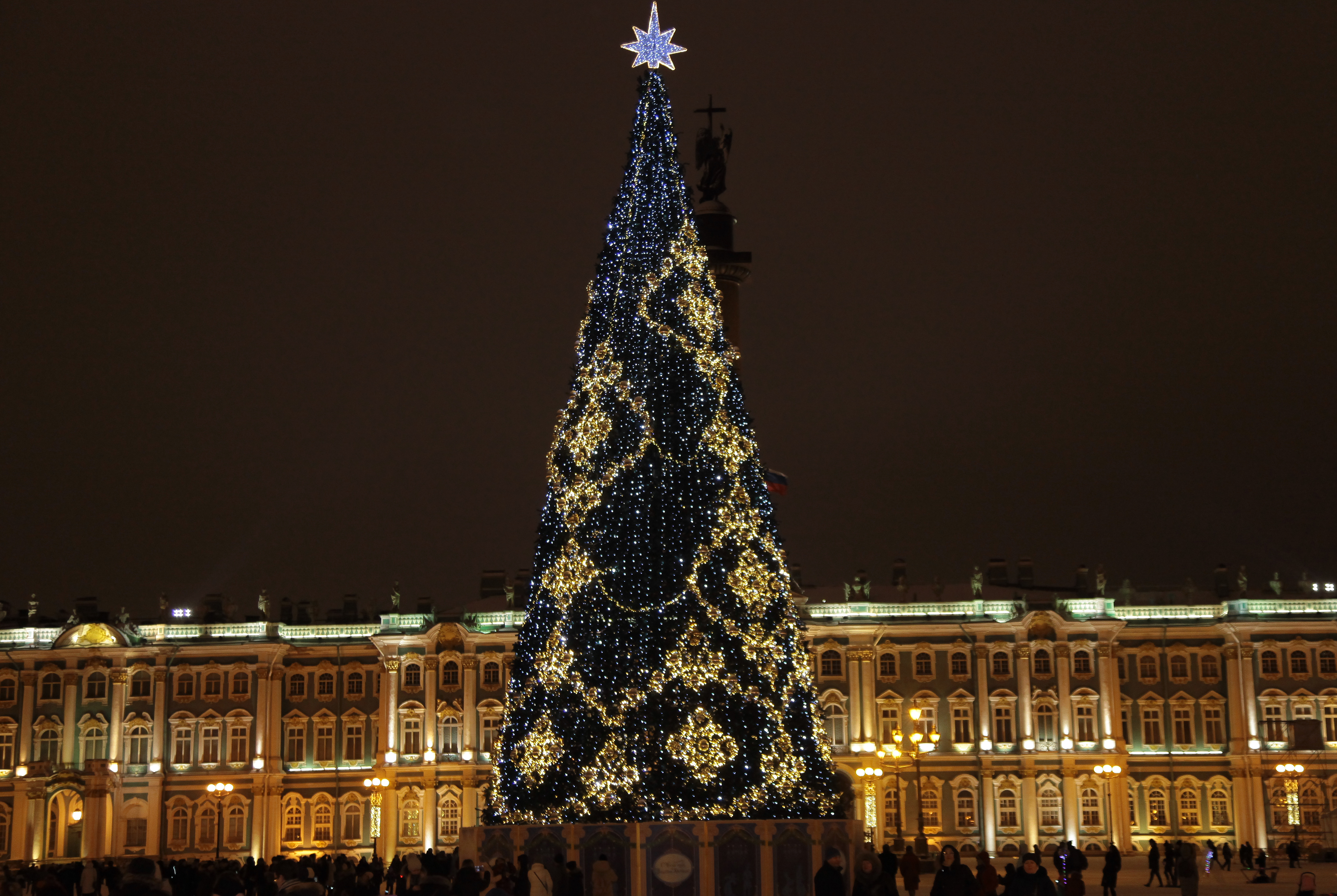 Зимой на Дворцовой площади устанавливают каток и новогоднюю елку. Все вокруг украшено сказочными огоньками. Царит атмосфера радости и праздника, несмотря на пронизывающий ветер и капризную погоду….. я Питер знаю, я там жила!